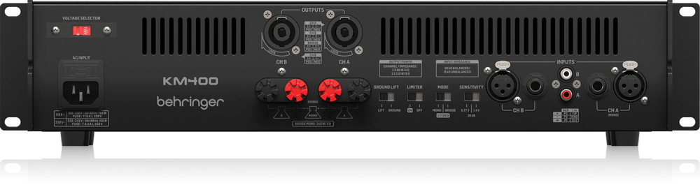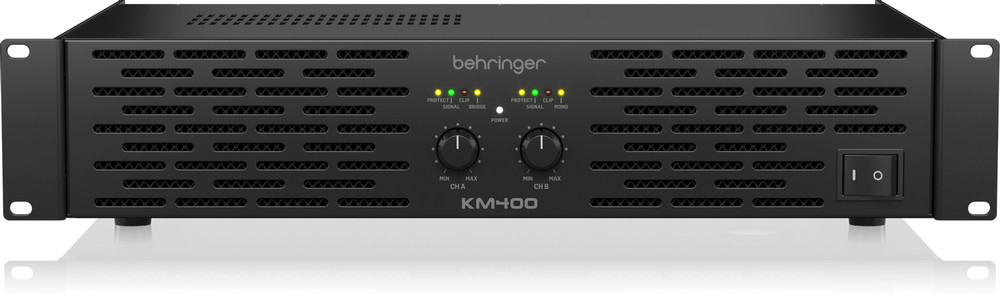 The Behringer KM400 is a professional 400-watt stereo power amplifier designed to deliver exceptional audio performance with precision and reliability. Built for live sound, studio applications, or installation use, it combines robust construction with advanced audio technology.